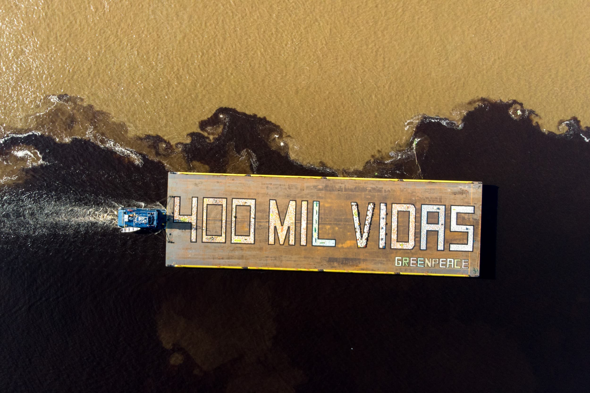 Em 2021, utilizando alimentos, máscaras, cilindros de oxigênio e produtos de higiene, o Greenpeace Brasil formou a mensagem “400 mil vidas” em uma balsa no Encontro das Águas, em Manaus. A ação foi uma homenagem às vítimas da Covid-19 e um chamado urgente por solidariedade e responsabilidade do Poder Público.