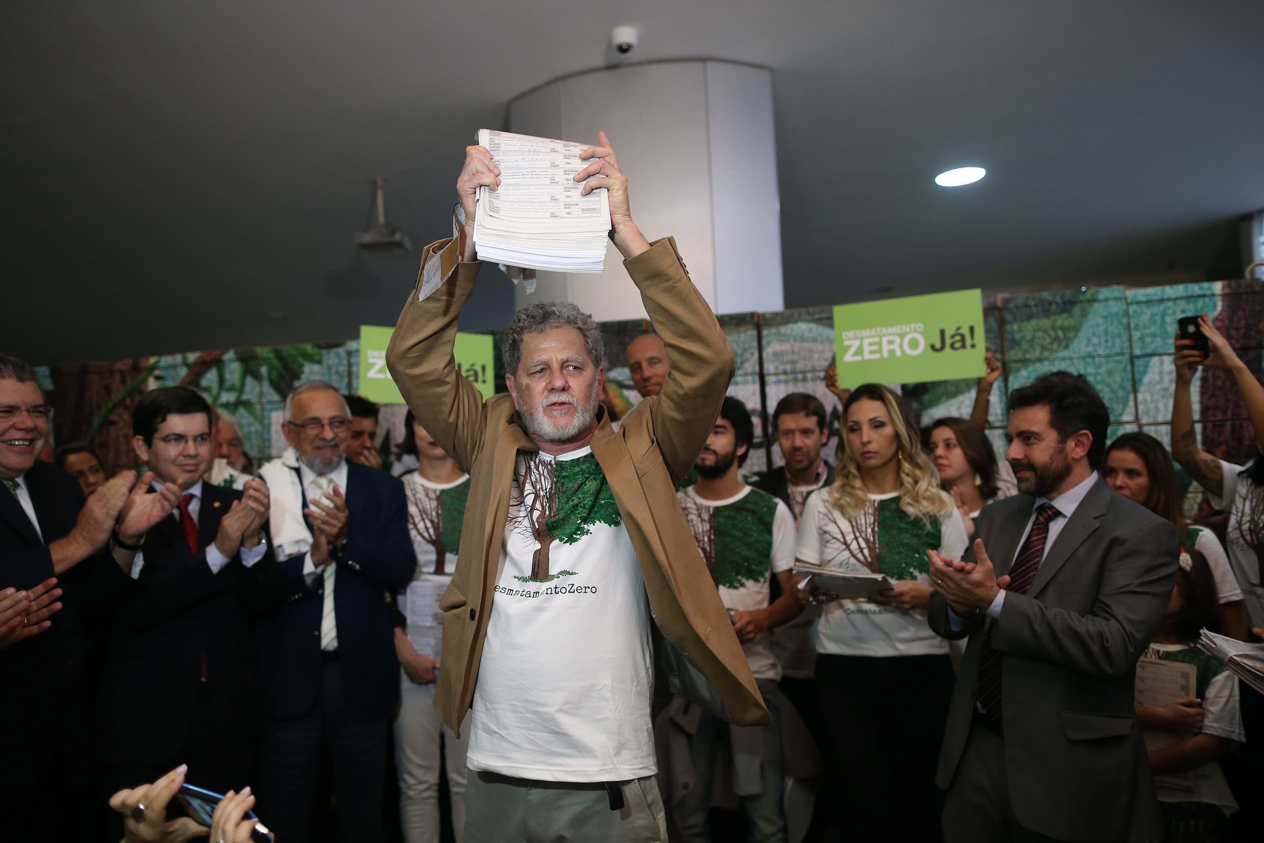 A partir de uma grande mobilização popular, o Greenpeace Brasil entregou ao Congresso Nacional um Projeto de Lei de Iniciativa Popular (PLIP) pelo Desmatamento Zero. Esse momento histórico, que contou com a participação de celebridades e outras personalidades públicas, marcou a primeira vez que a sociedade civil protocolou no Legislativo uma proposta para banir a destruição das florestas em todo o país.