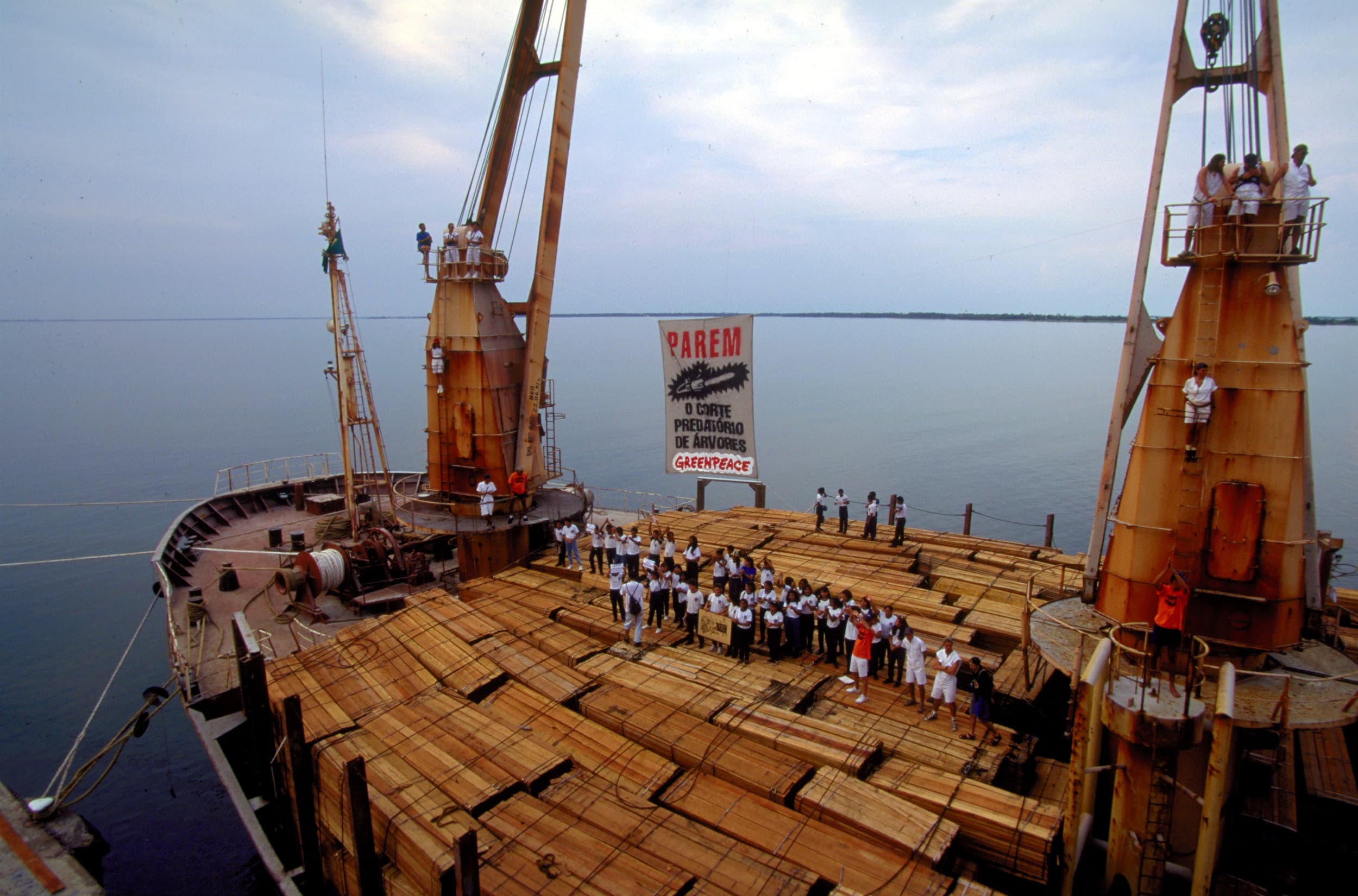 Ativistas do Greenpeace Brasil e estudantes impediram que um navio ucraniano partisse de Santarém, no Pará, com madeira da Amazônia para exportação à França, Holanda e ao sudeste asiático. O carregamento do navio foi interrompido por mais de duas horas.