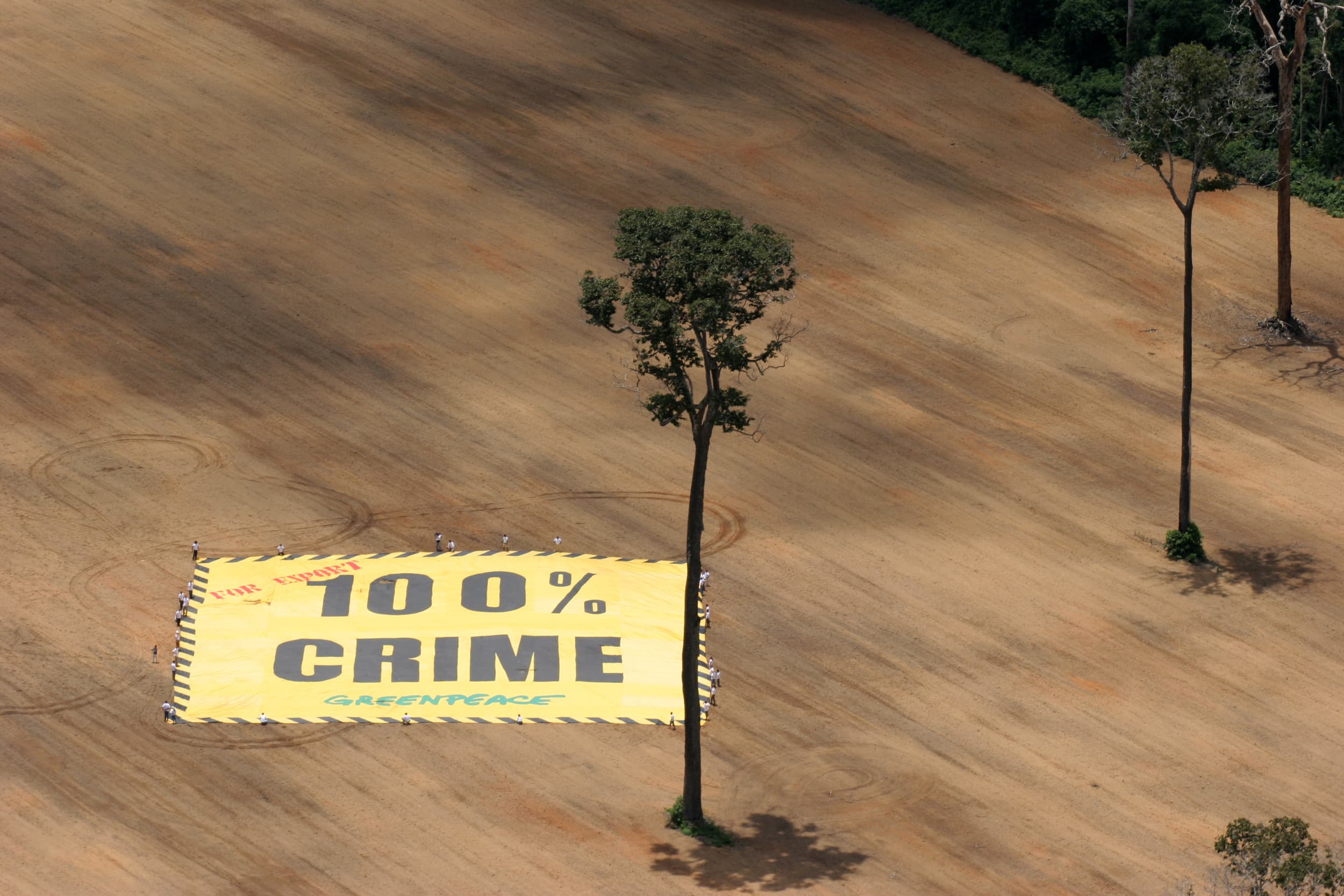 Para impulsionar a mobilização, os ativistas do Greenpeace realizaram uma ação pacífica e ocuparam uma área de 1.645 hectares desmatada ilegalmente em Santarém, no Pará, estendendo uma enorme faixa de 2.500 metros quadrados com a mensagem "100% crime florestal" para chamar a atenção para o problema.